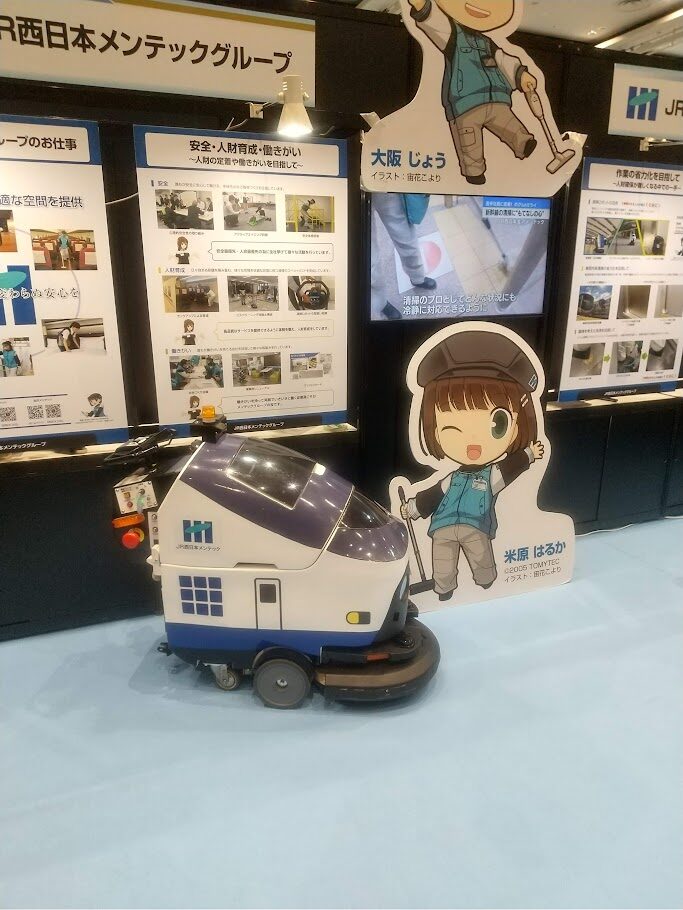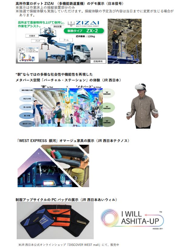JR西日本で使用されている高所作業ロボットや駅の掃除ロボット、ドローンの展示もありました。