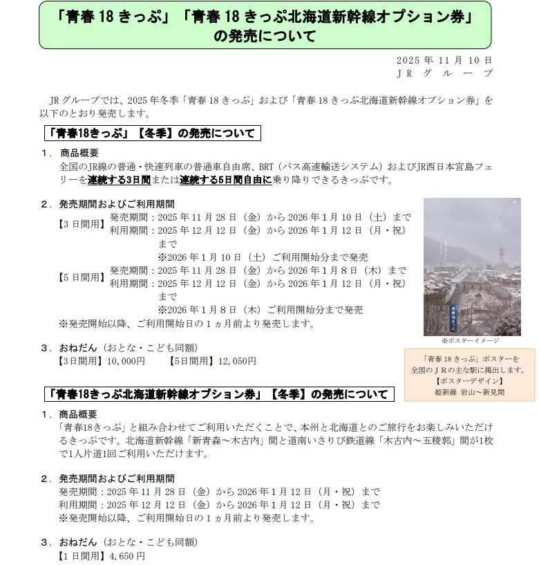 18きっぷ発売決りました 全国的なきっぷ 2025.11.11 全国的なきっぷ 開催日: 2025年12月12日 - 2026年1月12日カテゴリー: 全国的なきっぷ 18きっぷの利用可能期間です。 今年も発売されてよかったですね。